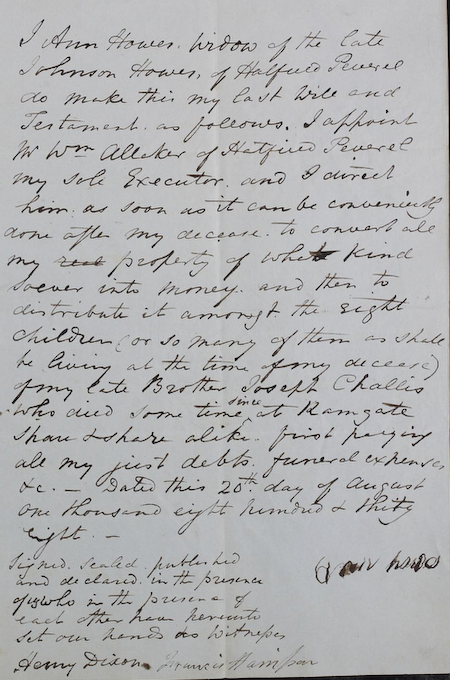 Joseph and Sarah Challis had a second son, William b 1760, who went into the army, was seriously injured and became a Chelsea pensioner. He married but there is no evidence of children. Joseph and Sarah also had two daughters; Sarah  b 1763 and Ann b 1766. Ann married Johnson Howes at Witham in 1800 and they live in nearby Hatfield Peverel. Johnson Howes died in 1838 and Ann made her will very shortly after his death. She left her estate to the eight children of her late brother Joseph Challis of Ramsgate. This establishes beyond doubt that Joseph Challis of Ramsgate was son of Joseph Challis and Sarah Havers of Witham, Essex.